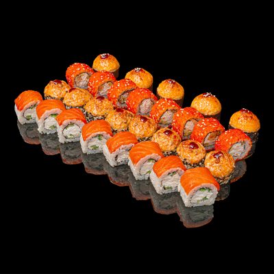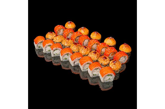 Состав: Филадельфия классическая, Аригато, Лосось хот запечённый, Токио с крабом запечённый.
